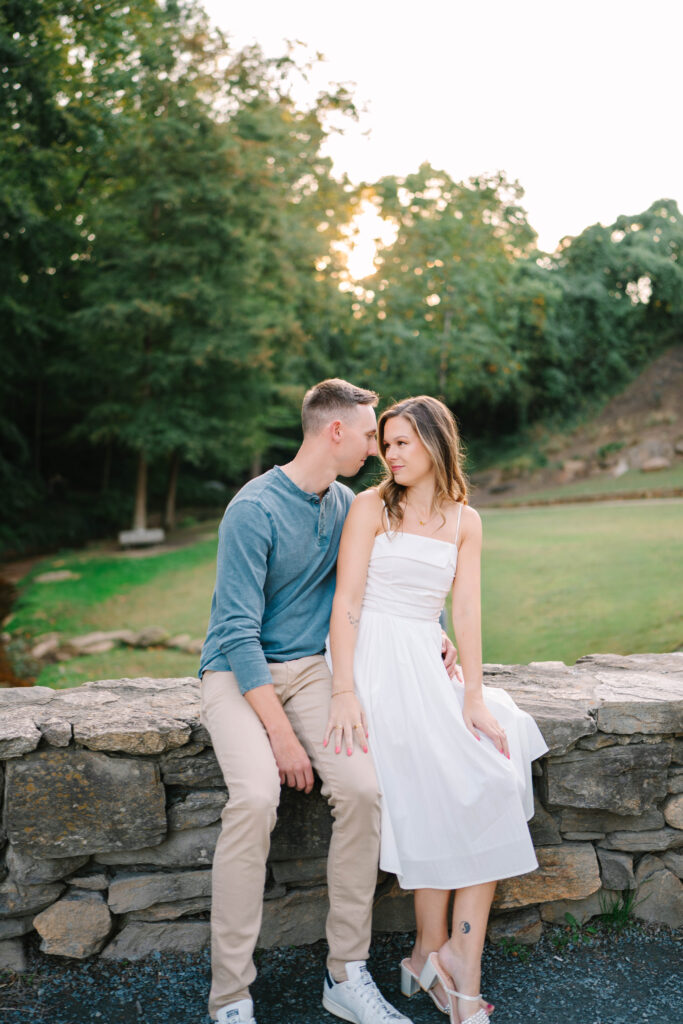 We started in Falls Park, which glowed softly in the late afternoon. The trees shimmered in golden light, and the river added a perfect soundtrack. Alex and Zack were ready to have fun, and their dog quickly became the star of the session. He sat proudly between them, tilted his head like a little model, and added playful moments to every frame. The candid interactions — the belly laughs, gentle touches, and shared smiles — created images that felt completely natural.
