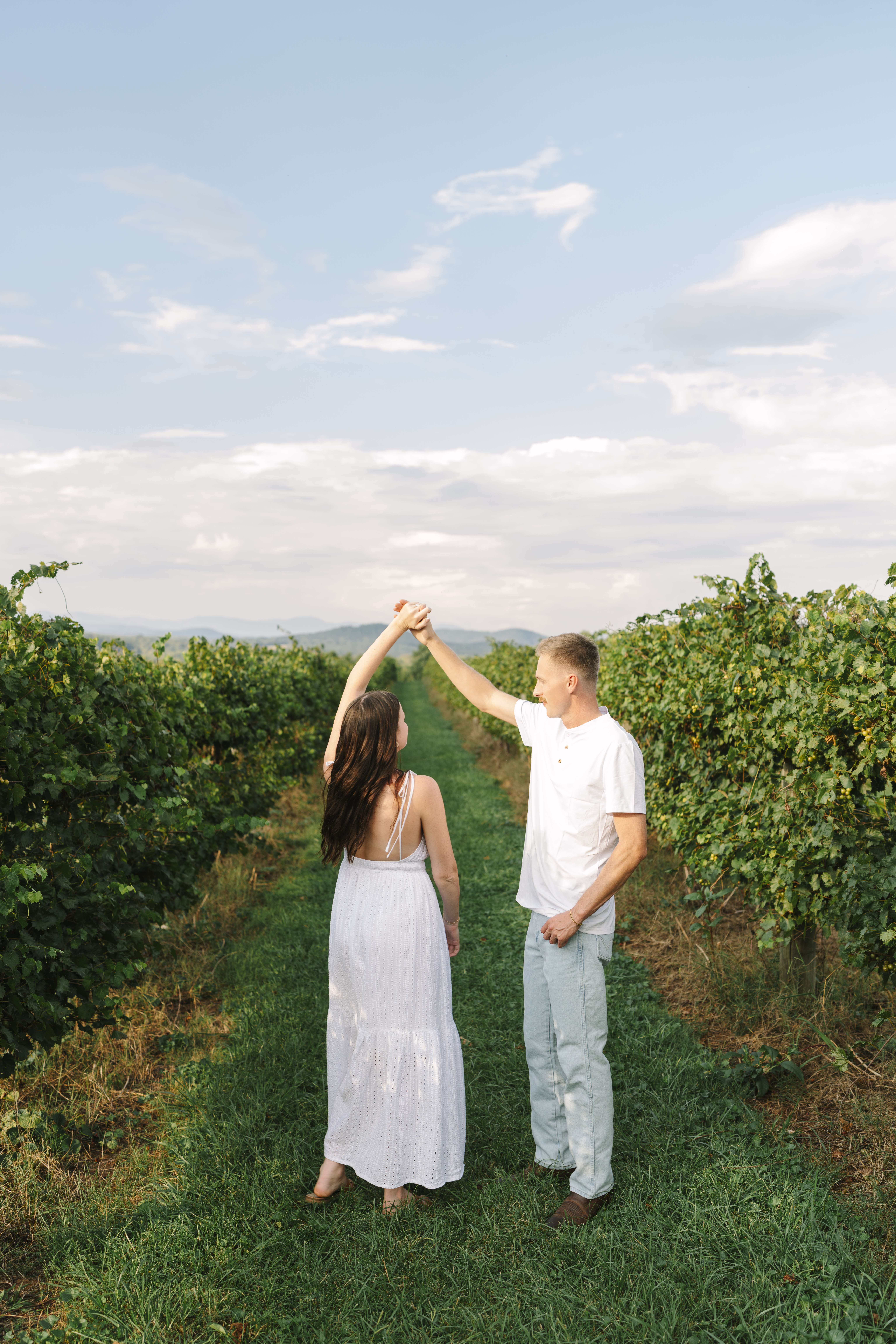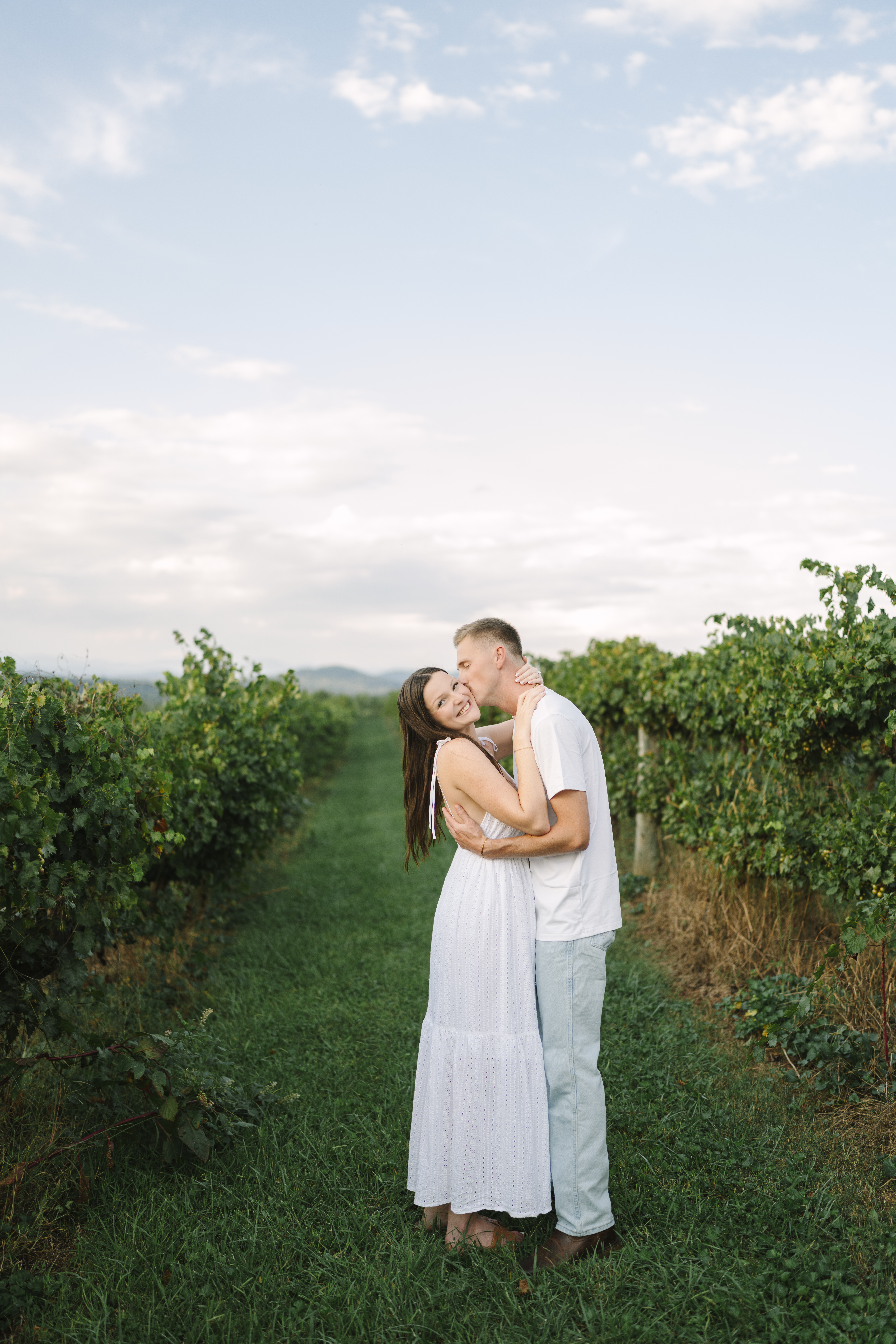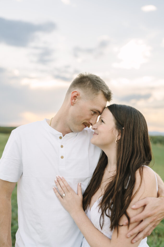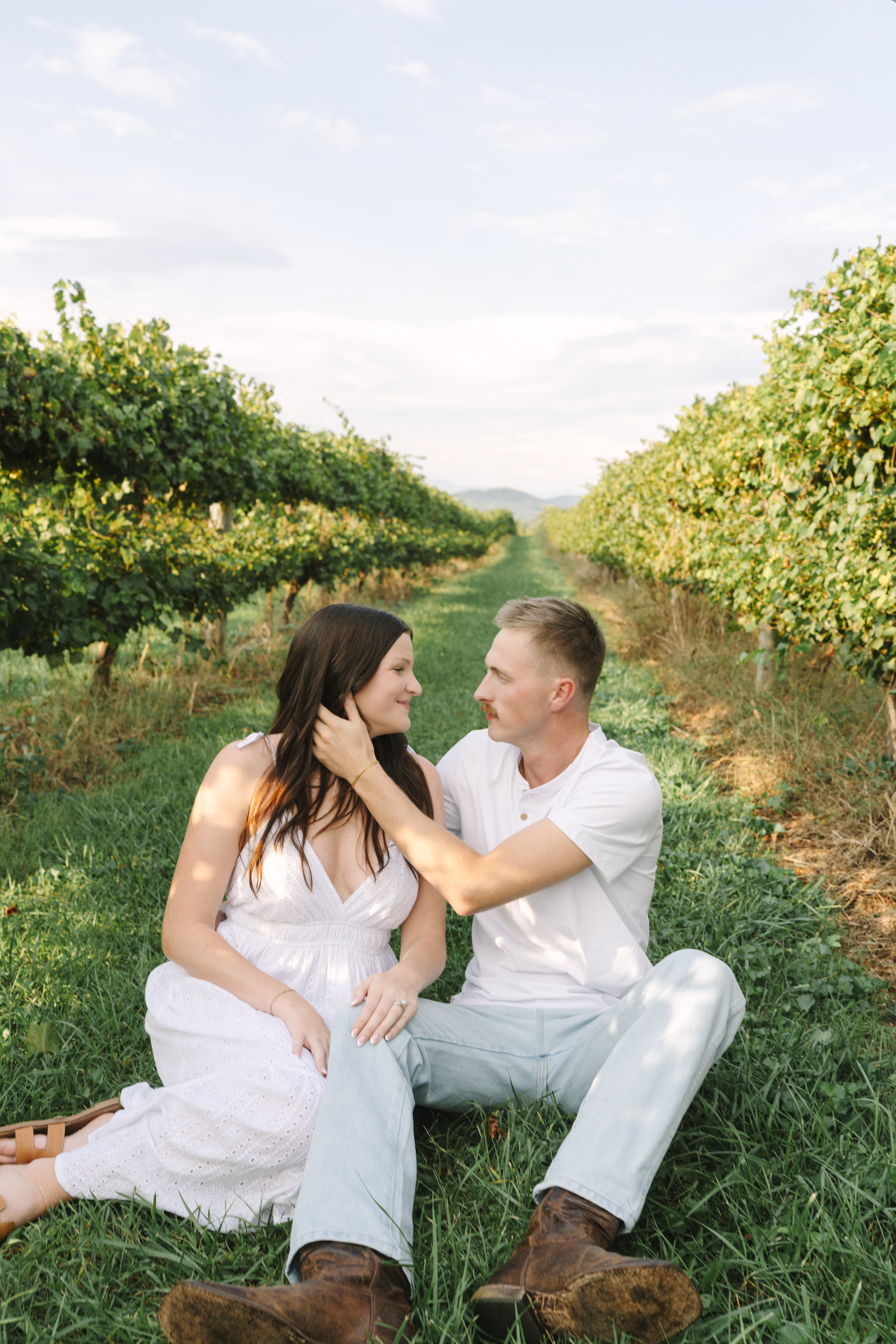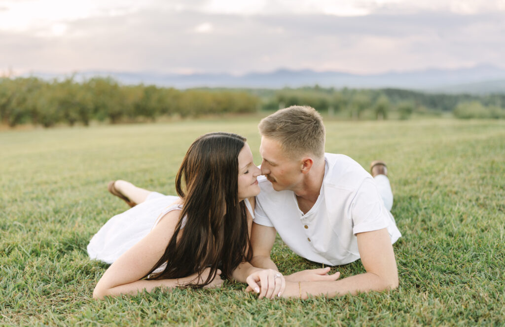 In the vineyard, the rows of green surrounded them, creating a simple, natural backdrop. Later, moving to the open fields, the mountains and clear blue sky gave a wider, fresh view. The colors didn’t just look pretty, they echoed the tone of their relationship: bright, steady, and hopeful.Throughout the session, they stayed relaxed and connected, whether walking to a new spot or preparing for a photo. These natural, unplanned moments showed their love just as clearly as any posed shot.